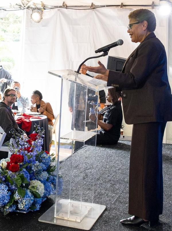 Mayor Karen Bass announces an initiative to ‘House Our Vets’ at a Nov. 16 luncheon at the Getty House that honored veterans who were housed this year through a similar program. Under the program, property owners are being encouraged to rent to veterans.