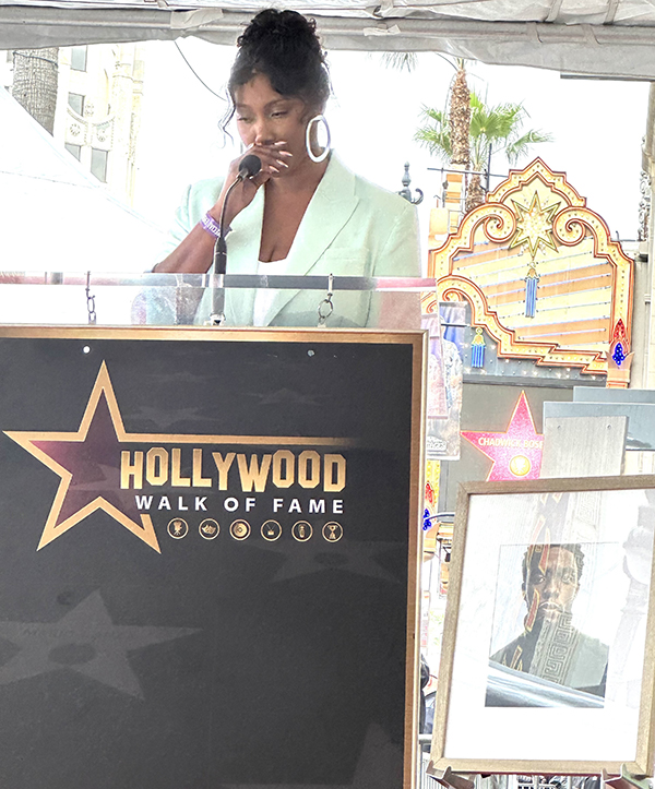Simone Ledward-Boseman, the widow of actor Chadwick Boseman, speaks Nov. 20 during the unveiling of Boseman’s star on the Hollywood Walk of Fame. Ryan Coogler, Michael B Jordan, Viola Davis, Leticia Wright and Boseman’s brothers, Derrick and Kevin also attended.