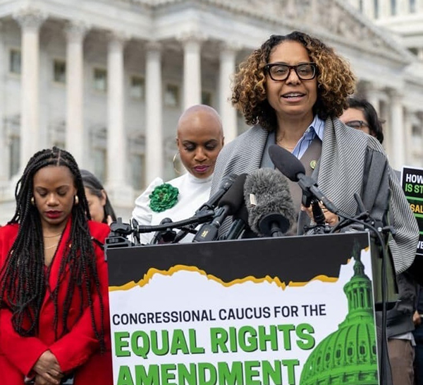 U.S. Rep. Sydney Kamlager-Dove, shown here speaking at a political rally earlier this year, says when Black women are forced out of the labor market, the nation suffers because it loses the expertise, voices and collective brilliance of Black women.