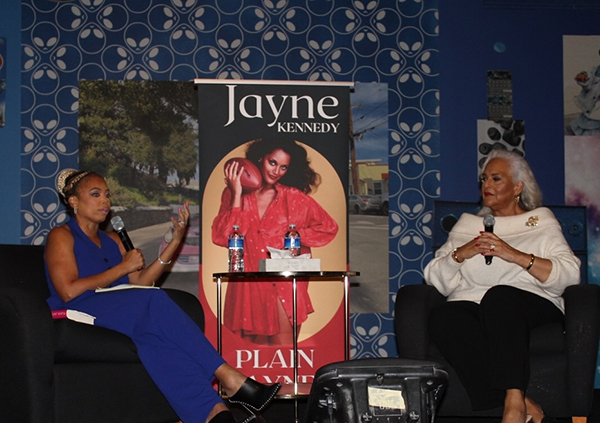 Jayne Kennedy, right, talks about her career with Jemele Hill at the California African American Museum Oct. 16. Kennedy is on a book tour promoting her memoir, ‘Plain Jayne.’
