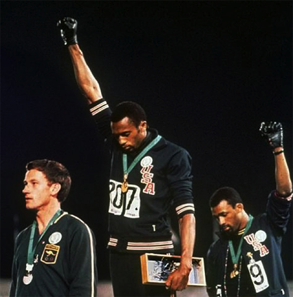 San Jose State track stars Tommie Smith and John Carlos raised gloved fists during a medal ceremony at the Summer Olympics in Mexico City, signaling their support for the Black Power movement, thrilling much of Black America and bringing global attention to the Nlack struggle for equality.